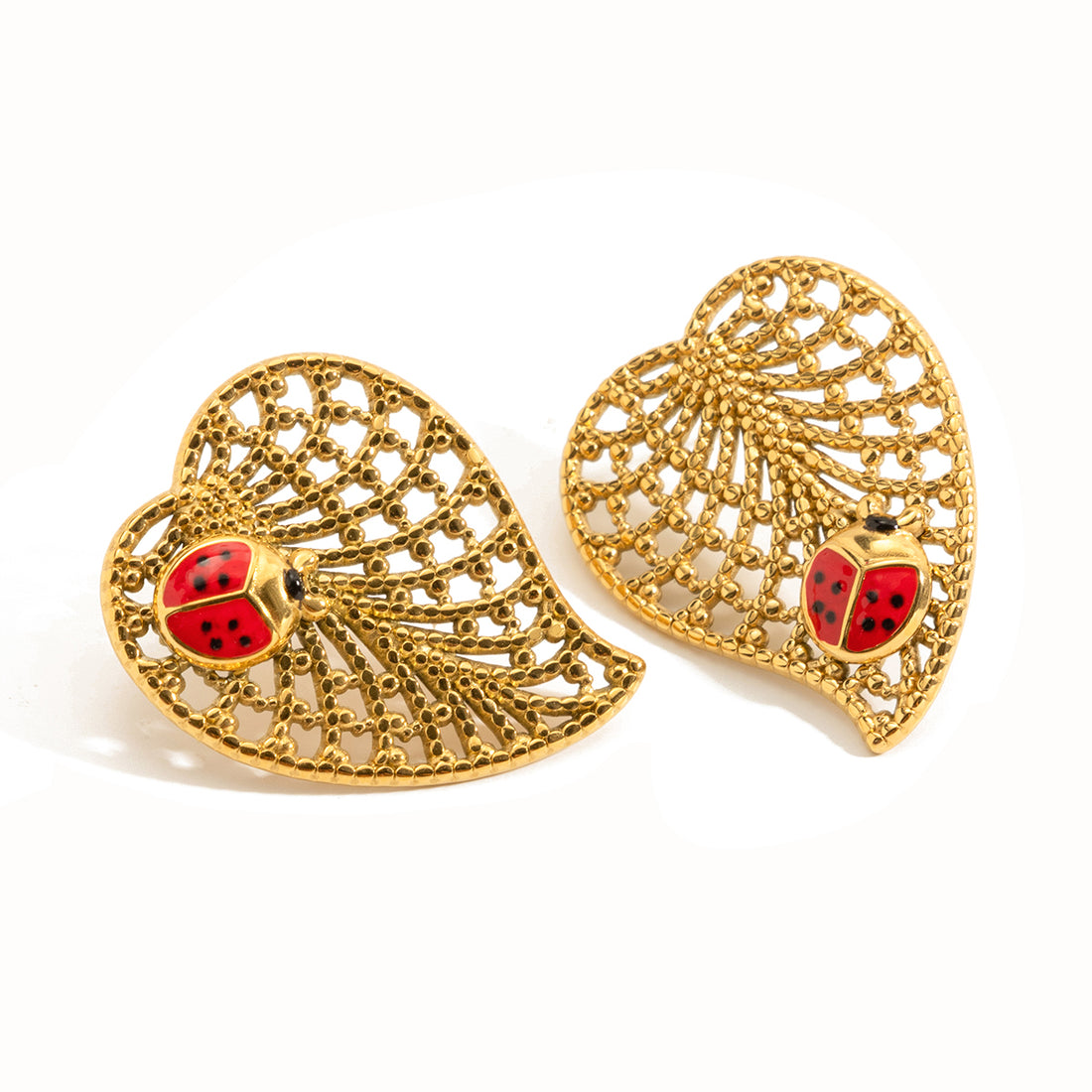 Classic Enamel Ladybug & Hollow Leaf Earrings 18K PVD Gold Plated Stainless Steel Add a...