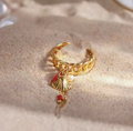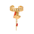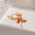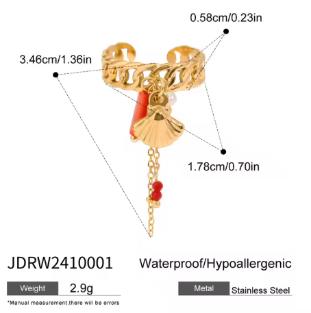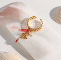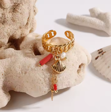 Dive into effortless coastal glamour with the Coral and Crystal Adjustable Ring. Beautifully crafted from 18K gold-plated stainless steel, this standout piece features a textured shell motif, shimmering crystal accents, and bold red coral-inspired details—capturing the magic of the sea in a modern, wearable design.