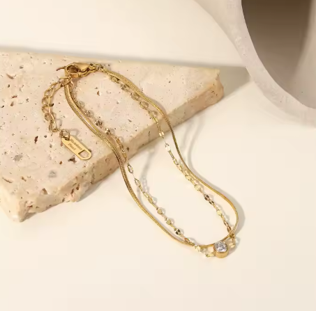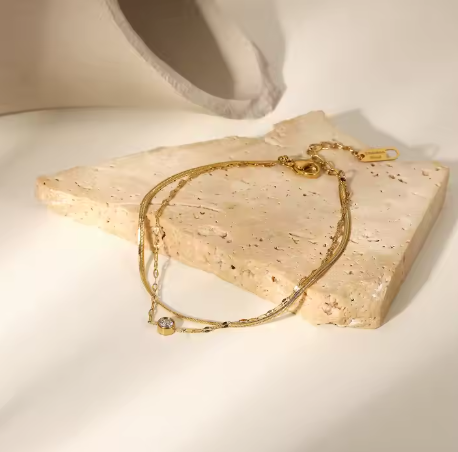 Add a touch of modern glam to your wrist with the Trendy Gold Layered Zircon Bracelet — a stunning piece designed to shine. Crafted from high-quality stainless steel with a radiant metallic gold finish, this bracelet features delicate layered chains adorned with a brilliant round zircon, offering a perfect mix of elegance and everyday wearability.