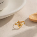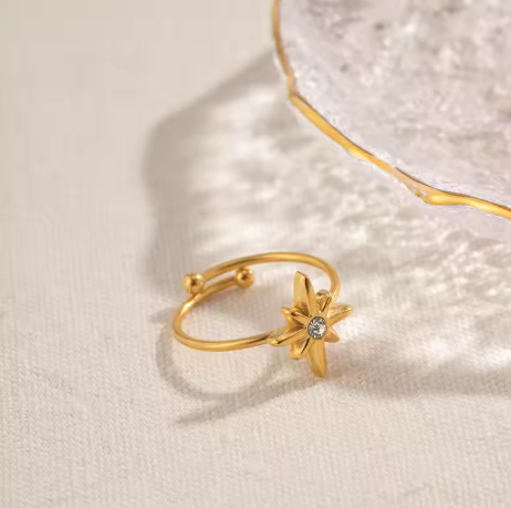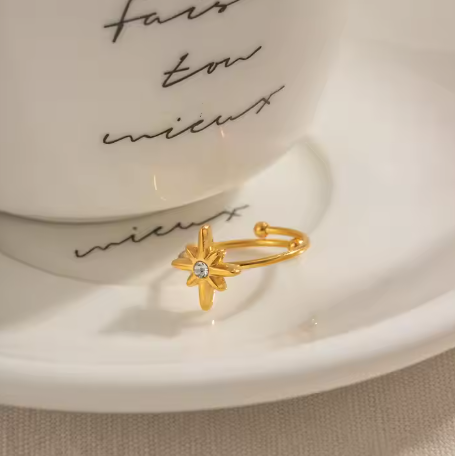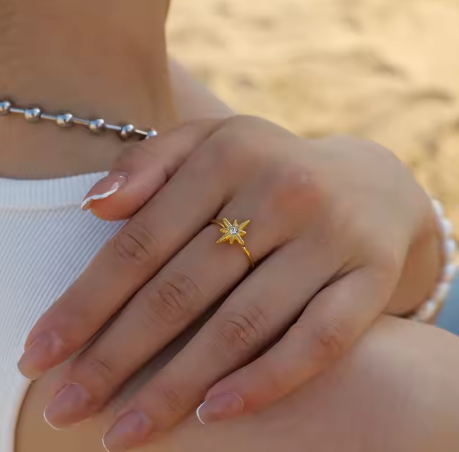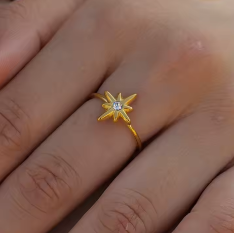 Shine with celestial elegance in the 18K Gold-Plated White Zirconia Octagram Ring — a dazzling piece designed to captivate. Crafted from waterproof stainless steel and finished in rich 18K gold plating, this ring features a brilliant octagram (eight-pointed star) design adorned with sparkling white zirconia, symbolizing balance, harmony, and radiance.